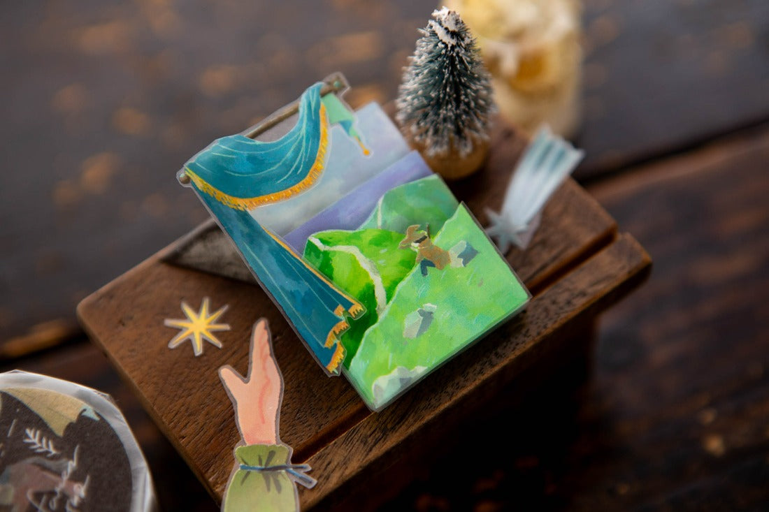 Ours Studio Wayfarer 2 PET Tape is a fantasy world in a roll — a richly illustrated matte PET tape packed with mythical and adventurous imagery across an 89cm repeating cycle. Each pre-cut element tells its own small story: a rider on horseback scattered with gold stars, a glowing celestial compass globe, an enchanted forest clearing reflected in still water, ornate decorative pillars with botanical details, a cloaked figure crowned in gold accompanied by a raven, a leather-bound adventure journal, a magical blue cloak in a cameo frame, flowing ribbons and trailing botanical vines, shooting stars, and a luminous crescent moon vessel.