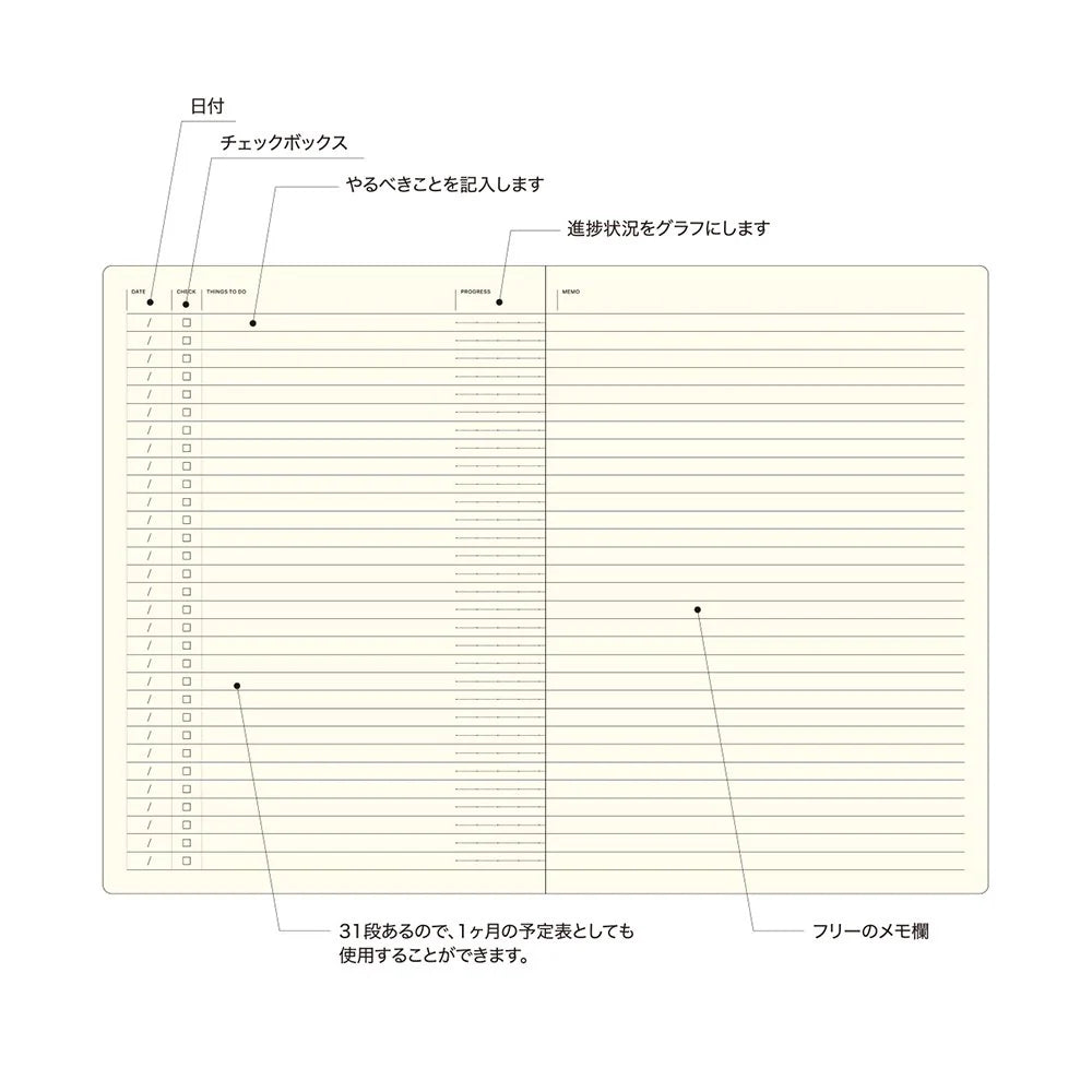 Each list includes a progress bar for tasks that stretch across multiple days or sessions, so you can track momentum without losing your place. A handy reference page rounds things out with an 18cm ruler and space for personal information — the small practical touches that remind you this notebook was designed by people who actually use notebooks.